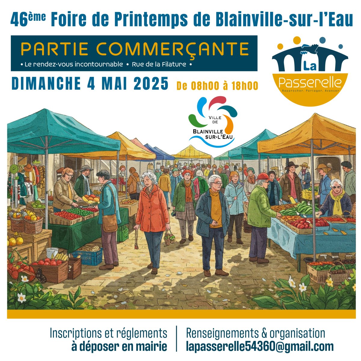 Chaque 1er dimanche du mois de mai, La Passerelle est aux commandes de la partie "commerçants" de la grande Foire de printemps de Blainville-sur-l'Eau. C'est le temps fort de la visibilité pour nos adhérents, une vitrine exceptionnelle pour aller à la rencontre du grand public et faire rayonner nos savoir-faire.